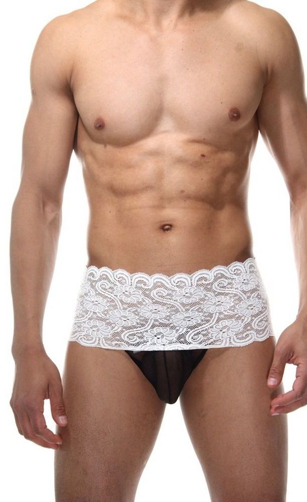 Мужские танга с высокой посадкой, на широком поясе из белого кружева. Сзади черная шнуровка на всю высоту трусов. Низ трусов из черной тянущейся гладкой ткани.