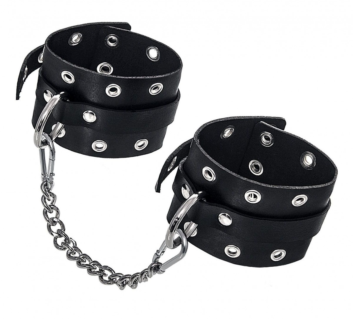 Эти однослойные кожаные оковы с контрастной строчкой красного цвета могут стать стильным аксессуаром, а могут послужить вашим целям по своему прямому назначению. Частичное обездвиживание и невозможность двигать руками или ногами дают вам полную власть над партнером – взрослые игры для взрослых. Наличие двух колец и карабинов, соединенных между собой кожаным ремешком, позволяет использовать изделие как раздельно – аксессуар-манжеты, так и как оковы для фиксации. К широким металлическим кольцам также можно присоединить и другие аксессуары при помощи карабинов. Благодаря универсальному размеру оковы могут использоваться и мужчинами, и женщинами. Размер легко регулируется с помощью металлических пряжек, органично вписывающихся в общий стиль. Длина манжет - 25 см, ширина - 6,5 см. Длина сцепки - 17 см.
