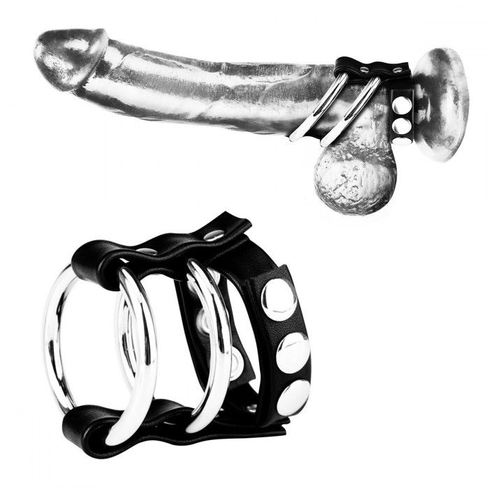Эти регулируемые кольца с защелкивающимся клепочным ремнем прижимает член и мошонку, удерживая пенис металлическим кольцом.